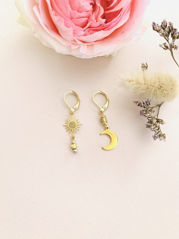 Boucles d’oreilles « lune/soleil », composées de capsule d’aluminium doré clair, de perles de rocaille, d’acier inoxydable