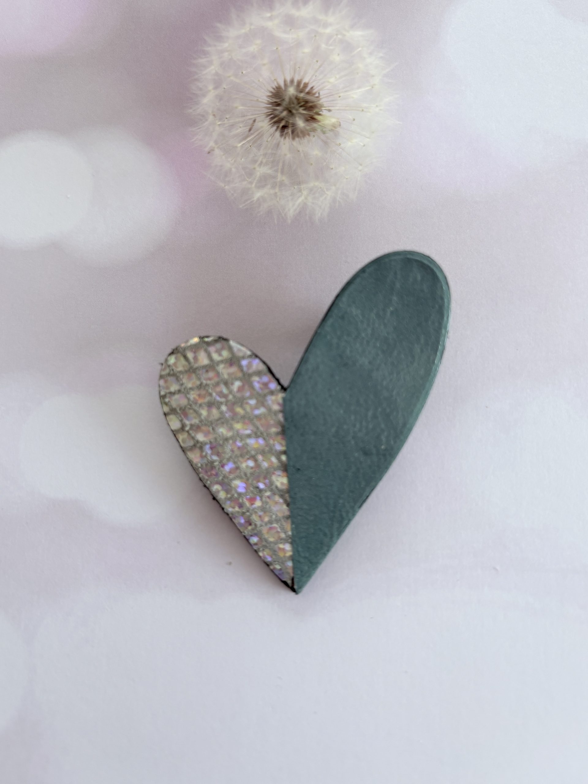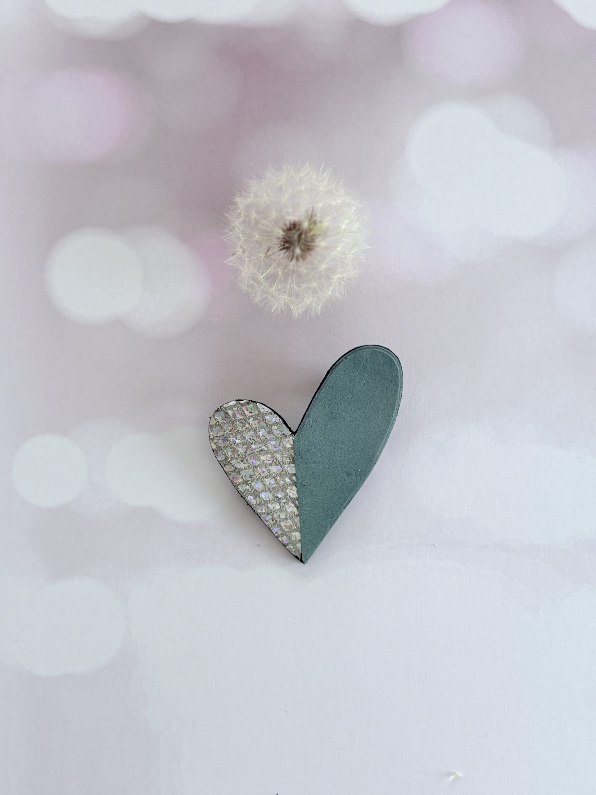 Broche cœur « Be love » en cuir bleu eucalyptus et argent holographique irisé