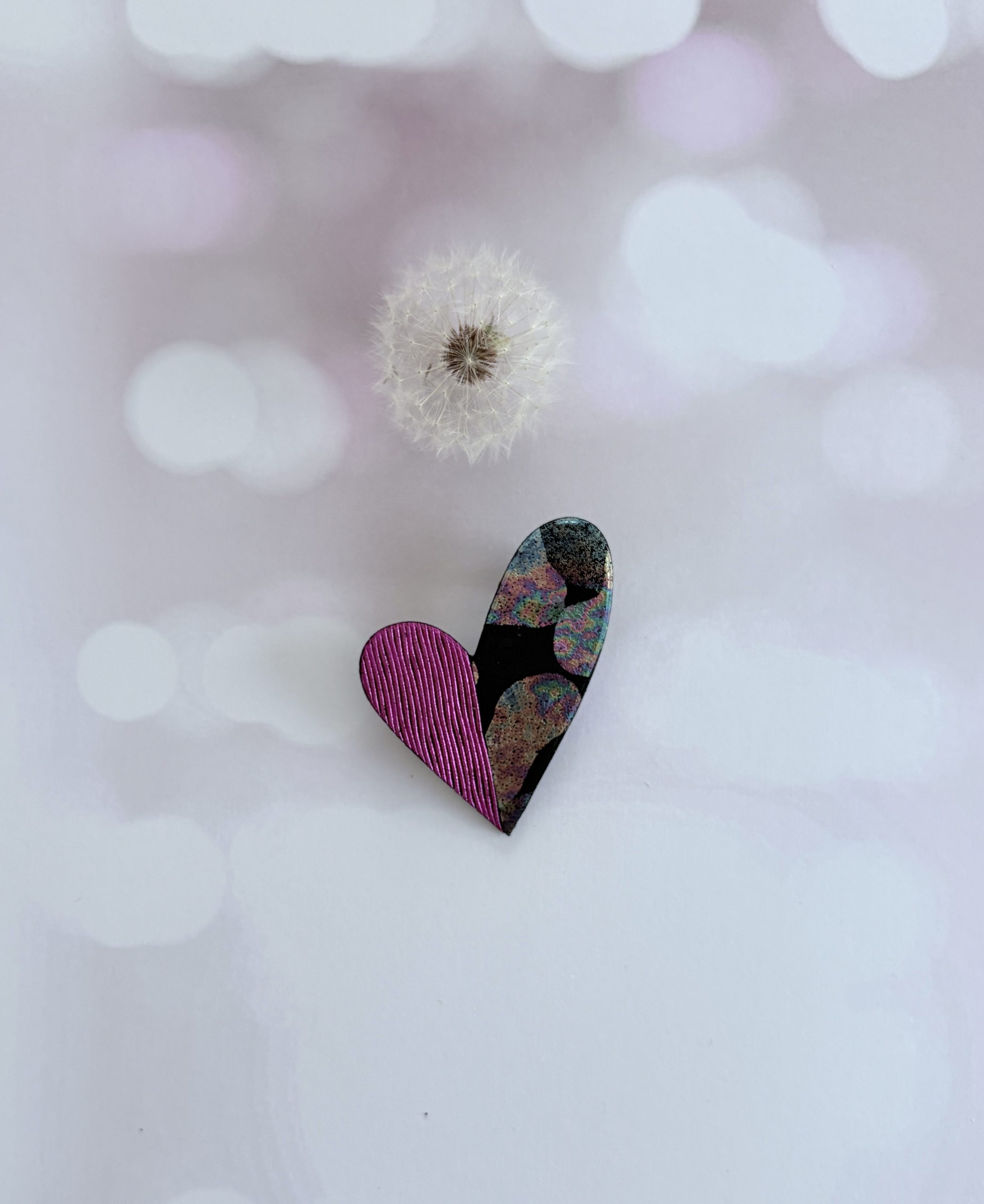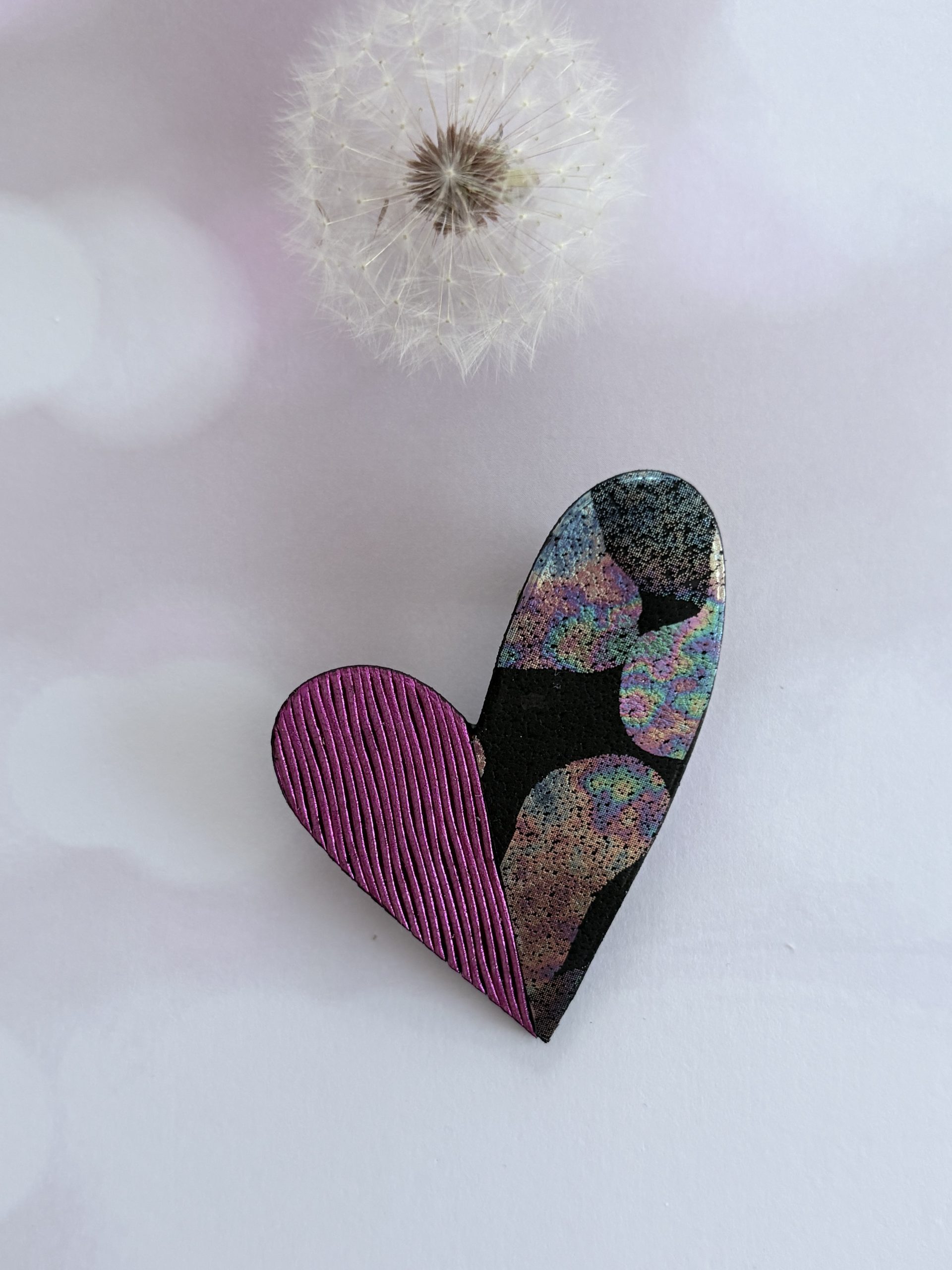 Broche cœur « Be love » en cuir fuchsia strié et noir tacheté irisé