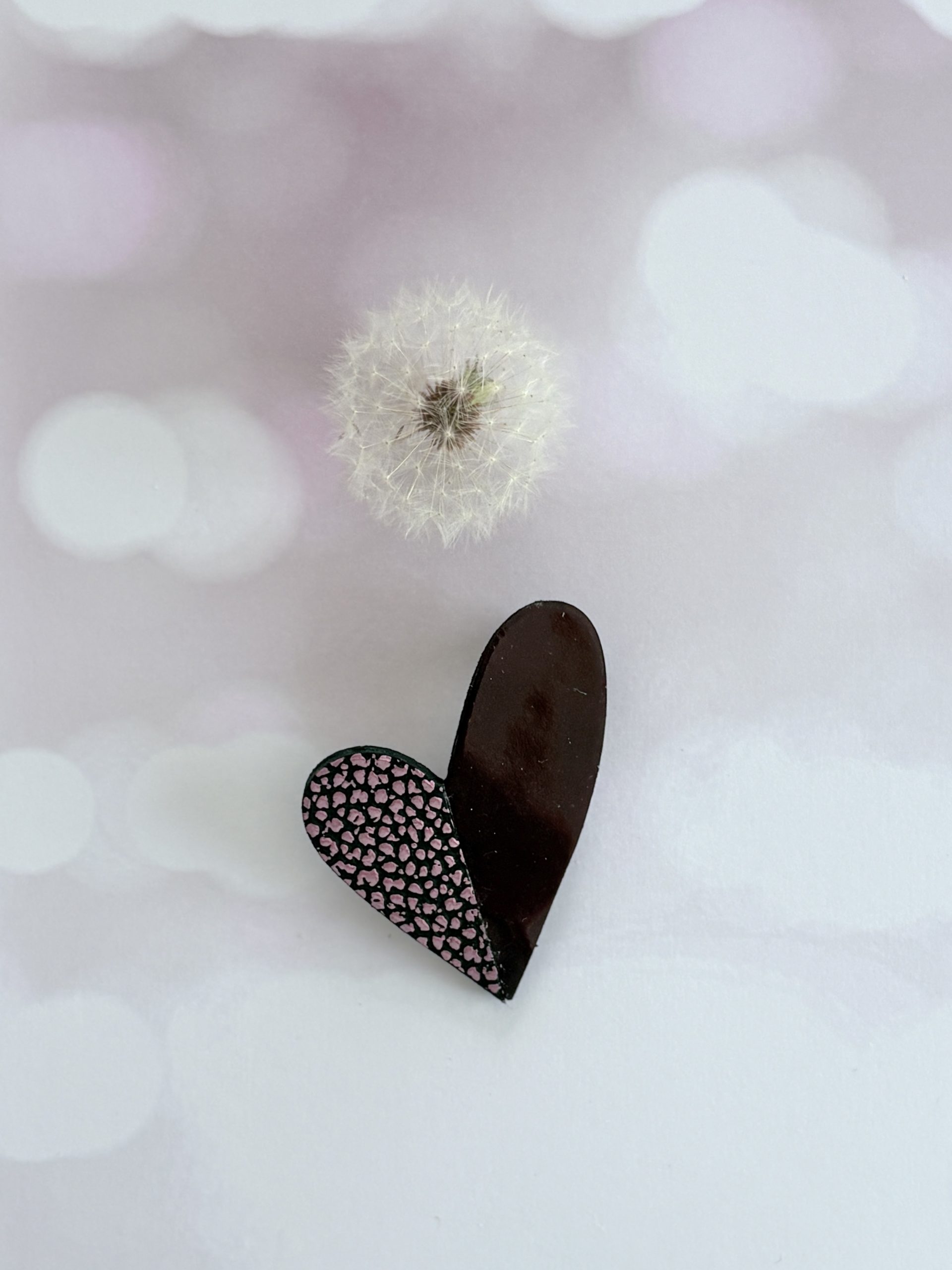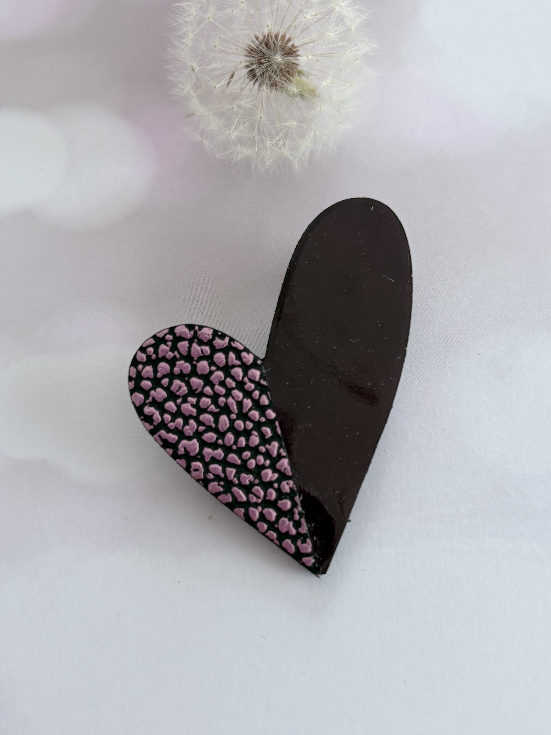 Broche cœur « Be love » en cuir pourpre glacé et noir et rose