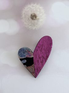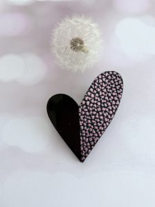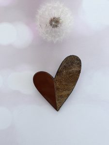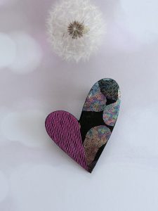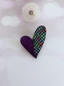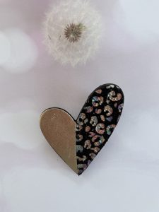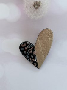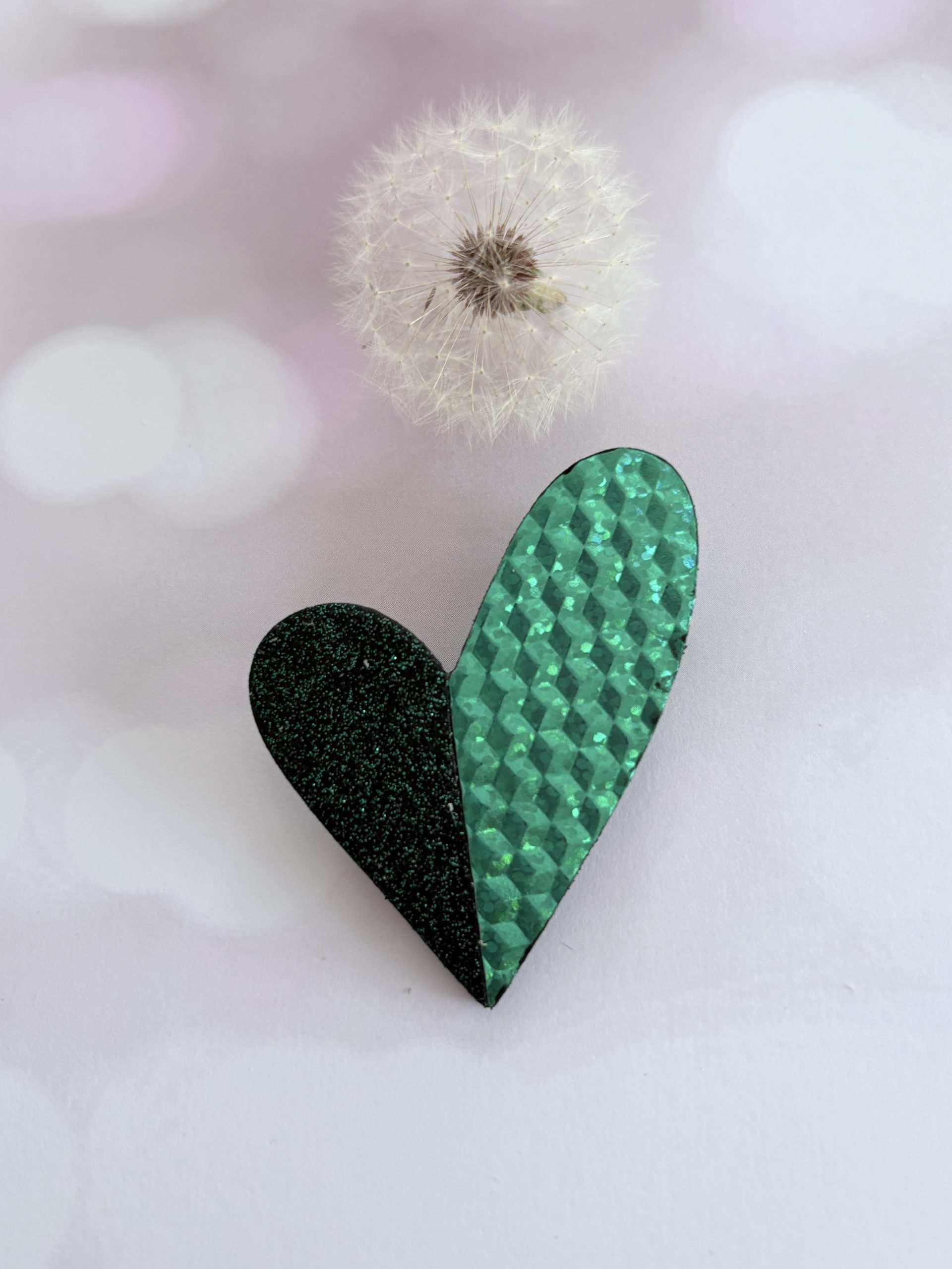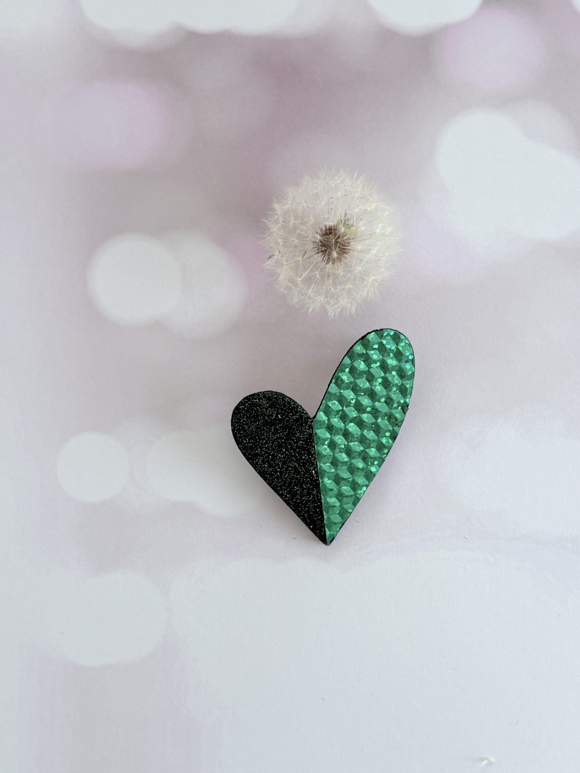 Broche cœur « Be love » en cuir vert émeraude holographique et vert pailleté irisé