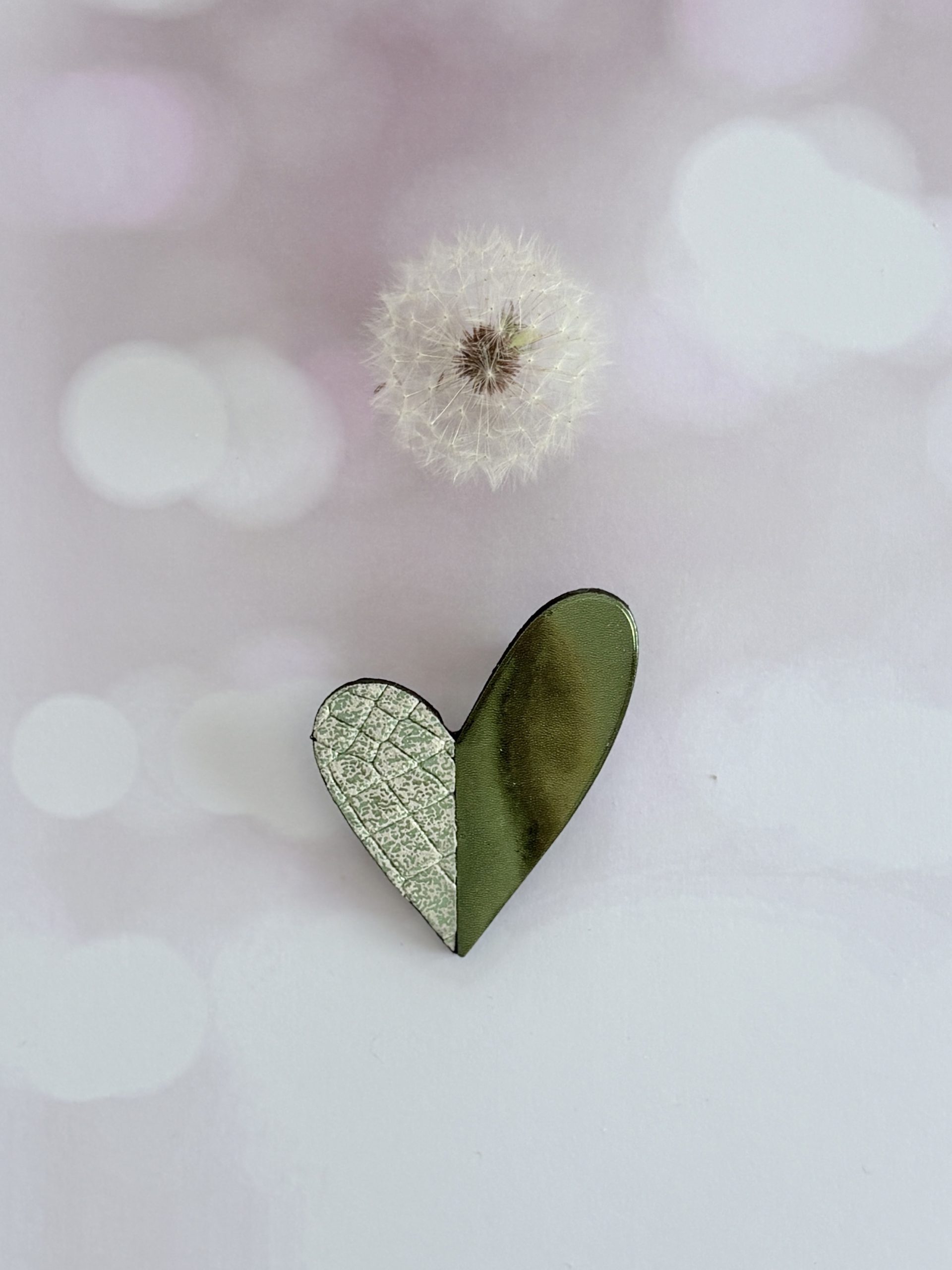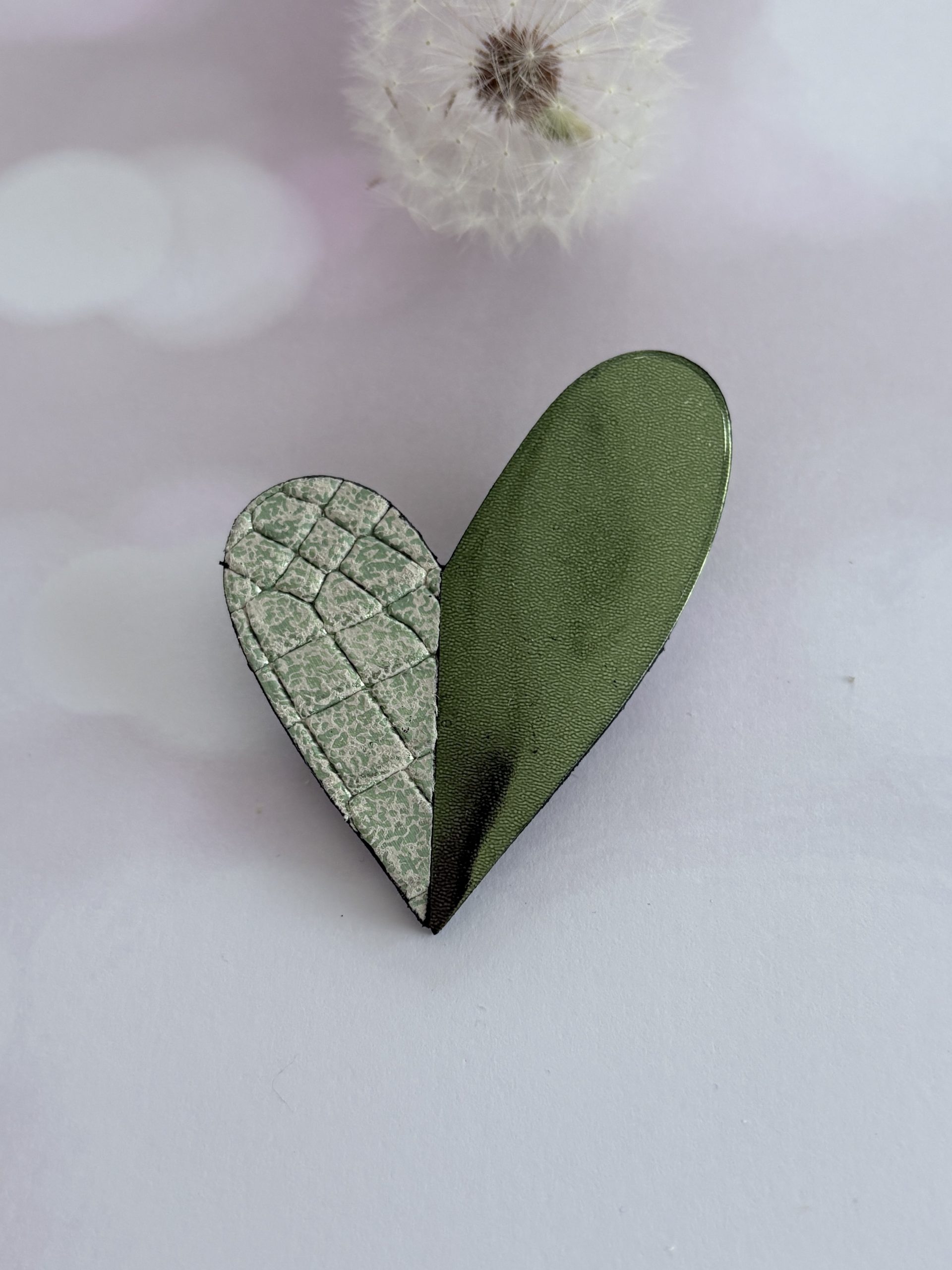 Broche cœur « Be love » en cuir vert miroir et blanc pailleté vert